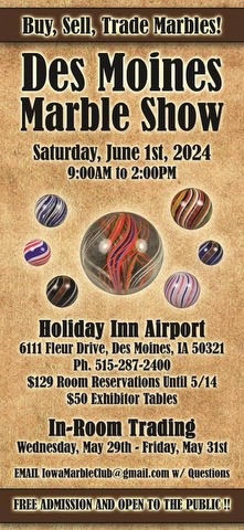 Join us in Des Moines Iowa May 29th – May 31st for the Des Moines Marble Show Show. Event will be held at the Holiday Inn Airport 6111 Fleur Drive Des Moines, IA 50321. Show will be on Saturday June 1st from 9:00 AM to 2:00 PM.